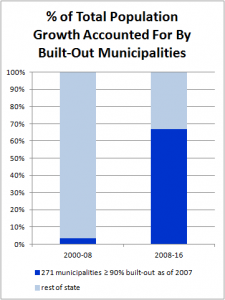 The 271 municipalities that were at least 90 percent built out as of 2007 (meaning that they have already built on most or all of their buildable land) accounted for a full two-thirds (66.8 percent) of total statewide population growth between 2008 and 2016. This same group of municipalities only accounted for a negligible 3.6 percent of total growth between 2000 and 2008, so the post-recession turnaround is quite dramatic.