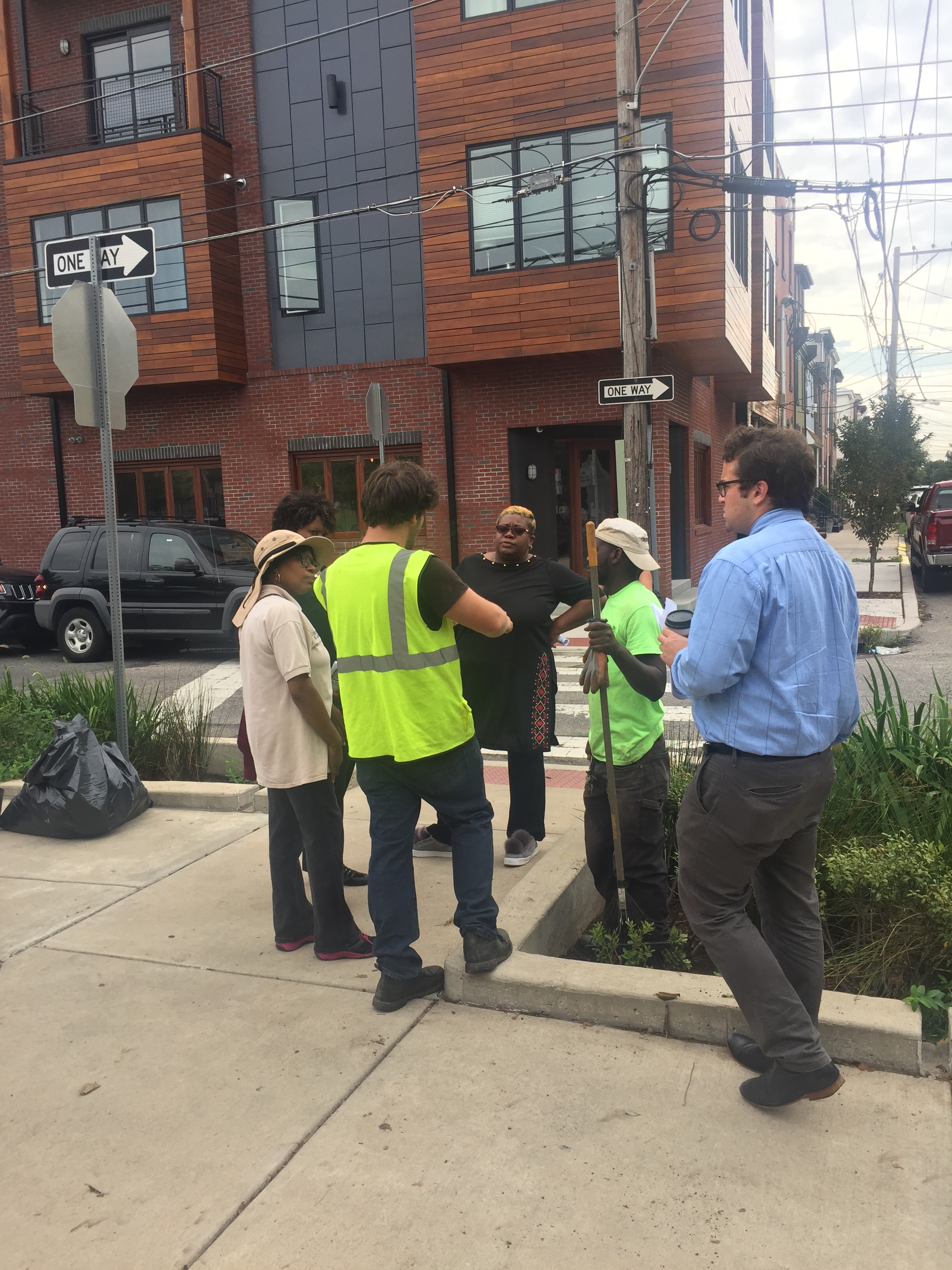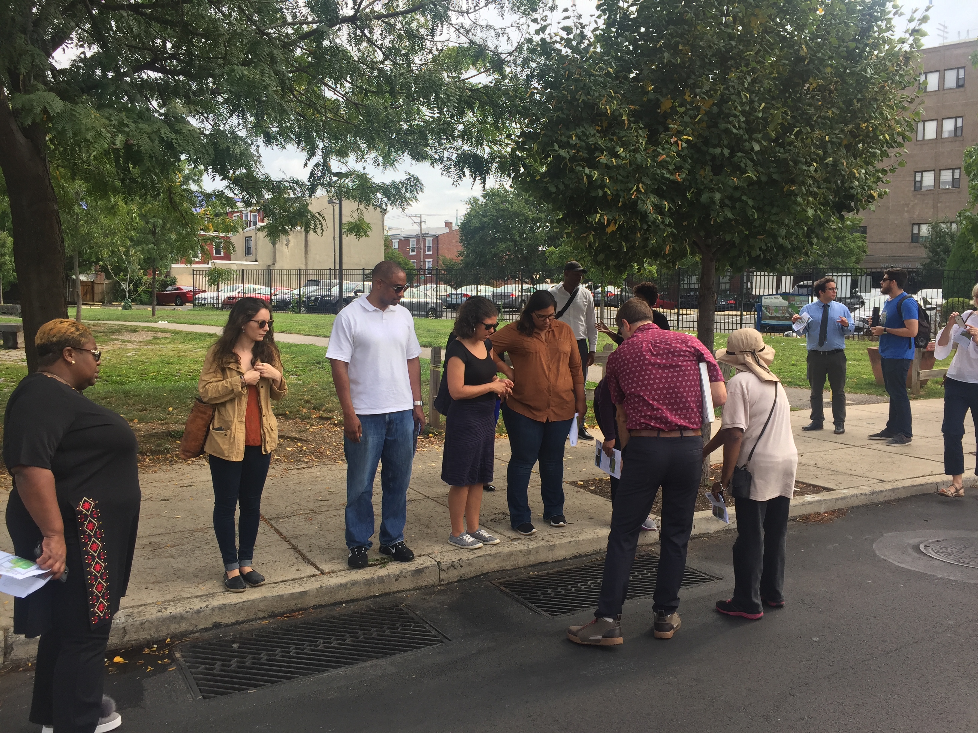 PWD staff demonstrate how stormwater runoff from the road is channeled to water street trees with large underground (and invisible) tree pits on this “green street.”