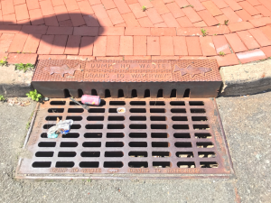 Storm drains collect stormwater and convey it to nearby waterways. The “Dump No Waste: Drains to Waterways” text is an example of public education. The trash caught in the drain shows the importance of regular maintenance. Photo credit: Andrew Tabas. Location: Trenton, NJ.
