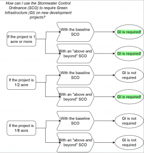 Once enacted, Stormwater Control Ordinances set a threshold for the size of an individual development project. If the project disturbs more than one acre of land, NJDEP requires that it employ green infrastructure. If it disturbs less than one acre of land, green infrastructure is not required.