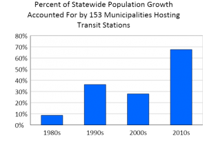 Facilitating more TOD would be a popular move among potential residents, if recent trends are any indication. The 153 transit-hosting municipalities grew twice as fast as the rest of the state between 2010 and 2020—the combined population of the transit municipalities increased by 7.7%, vs 3.4% growth for the balance of the state. Together, the transit municipalities accounted for more than two-thirds (67.6%) of total statewide population growth between 2010 and 2020, up substantially from the three previous decades, when jobs were clustering in suburban, car-dependent office parks, and when low-density residential subdivisions were the dominant form of new housing. Transit municipalities have transitioned from representing a disproportionately low share of total population growth in the prior three decades (they make up about half of total statewide population but were accounting for a much smaller share of new population growth) to now contributing a disproportionate majority of total growth.