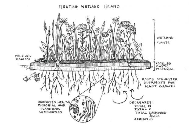 This illustration, sketched by Ivy Babson of Princeton Hydro, conveys the functionality of a floating wetland island.