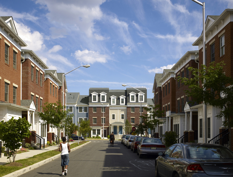 A total of 209 mixed-finance, mixed-income units have been built—72 stacked townhouses on the former industrial site and 137 stacked townhouses and flats in the last two phases built on the former public housing site, which complements an 83-unit senior building constructed in a previous phase. The townhouses and flats comprise one-, two-, three- and four-bedroom apartments in a compact urban form. Community support spaces have also been constructed on the public housing site. Four townhouses are located over a portion of this community support space in keeping with a goal of maximizing project density. Several buildings have been designed especially to fit the neighborhood street pattern, including angled street intersections, and to respect the alignment of the former Morris Canal, which passed through the site and is recognized though interpretive signage and paving design.