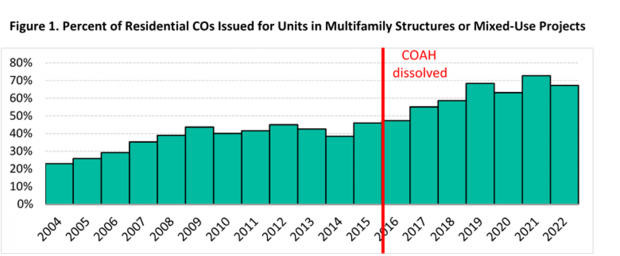 The Mount Laurel doctrine refers to a series of New Jersey Supreme Court decisions that direct municipalities to provide their “fair share” of the regional need for low- and moderate-income housing. For many years, enforcement of the requirements was the responsibility of the Council on Affordable Housing (COAH), but the Council was effectively dissolved in 2015 when the Court deemed it ineffective and handed enforcement authority back to the judicial system. Payne cited her organization’s 2023 report Dismantling Exclusionary Zoning: New Jersey’s Blueprint for Overcoming Segregation to point out that the annual production of affordable units increased substantially after 2015 under the subsequent more rigorous court oversight. (She pointed out that the vast majority of affordable housing is produced in the form of multifamily housing.) The report also found that most of the overall growth in multifamily housing (primarily apartments) over the same time period has been achieved in inclusionary Mount Laurel projects, projects that contain both income-restricted and market-rate units, to the extent that 81% of all multifamily units built since 2015 were built in connection with the Mount Laurel process. Reinforcing this relationship, Evans cited data showing certificates of occupancy (COs) for multifamily housing rising in the post-COAH era (see Figure 1 ) to the point where multifamily units now account for more than half of all housing production. “This shift in permitting activity is being driven by Mount Laurel-associated re-zonings,” Payne said.