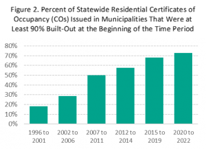 Many new Mount Laurel units will be constructed in redevelopment areas, if the overall pattern of population growth in recent years is any indication. Evans showed that most of the state’s housing growth over the last decade and a half has been happening in already-built-out areas (see Figure 2 ).