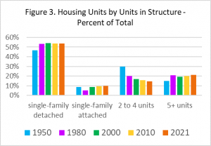 “Missing middle” housing options in buildings with 2 to 4 units have declined dramatically since 1950 as a share of total housing units.