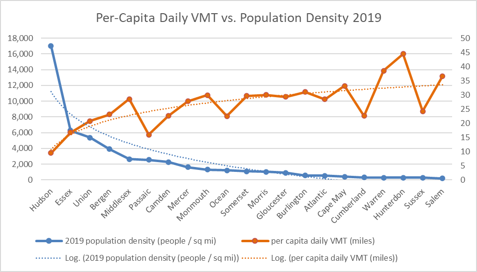 One need look no further than New Jersey’s own 21 counties to observe the relationship between urban form and travel. Residents of the state’s more urbanized counties like Hudson, Essex, Union, Bergen, and Camden, where cities and older suburban downtowns took shape before the automobile became the dominant mode of transportation, drive a lot less, on average, than residents of rural and exurban counties like Warren, Hunterdon, and Salem, where single-use zoning keeps different types of destinations far away from each other, necessitating car travel for just about every trip purpose. Consider the two ends of the spectrum: In Hudson County, with a 2019 population density of 17,077 people per square mile, the average person drives 9.5 miles per day, while in Hunterdon County, with a population density of only 287 people per square mile, the average person drives 44.4 miles per day—nearly five times as much as in Hudson County.3